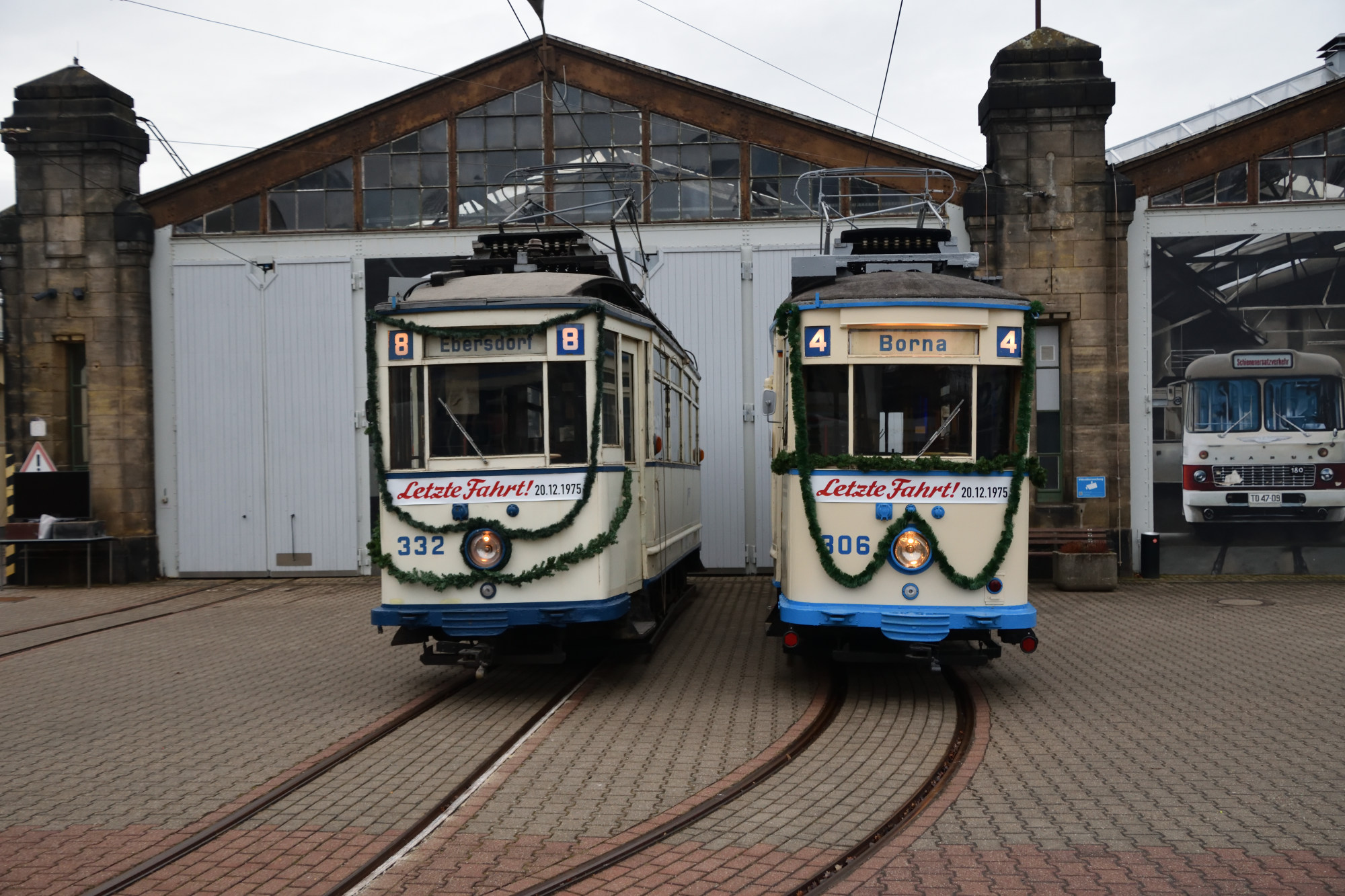 332 als Linie 8 und 306 als Linie 4 vor dem Straßenbahnmuseum