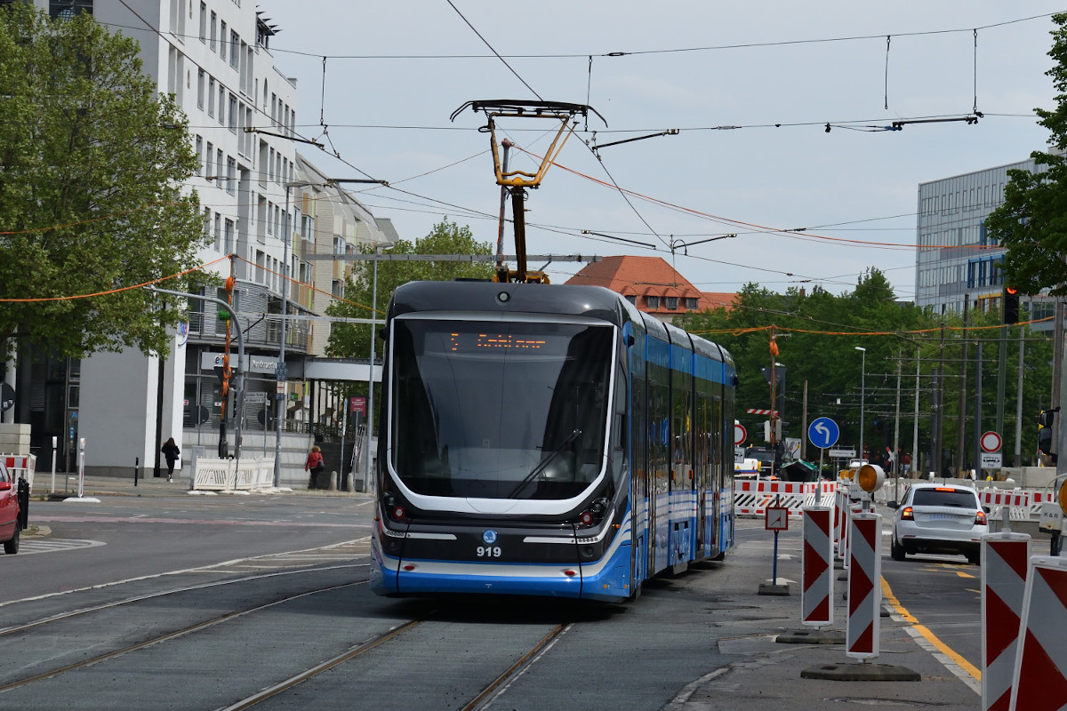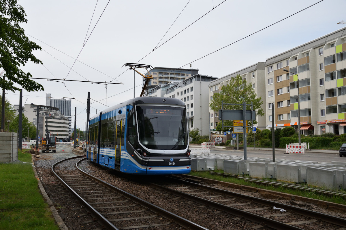 919 verlässt die Haltestelle Brückenstraße/Freie Presse und fährt in die Baustelle