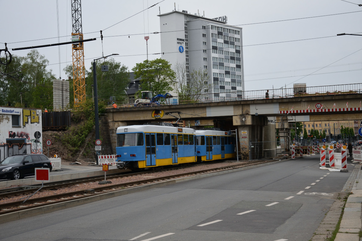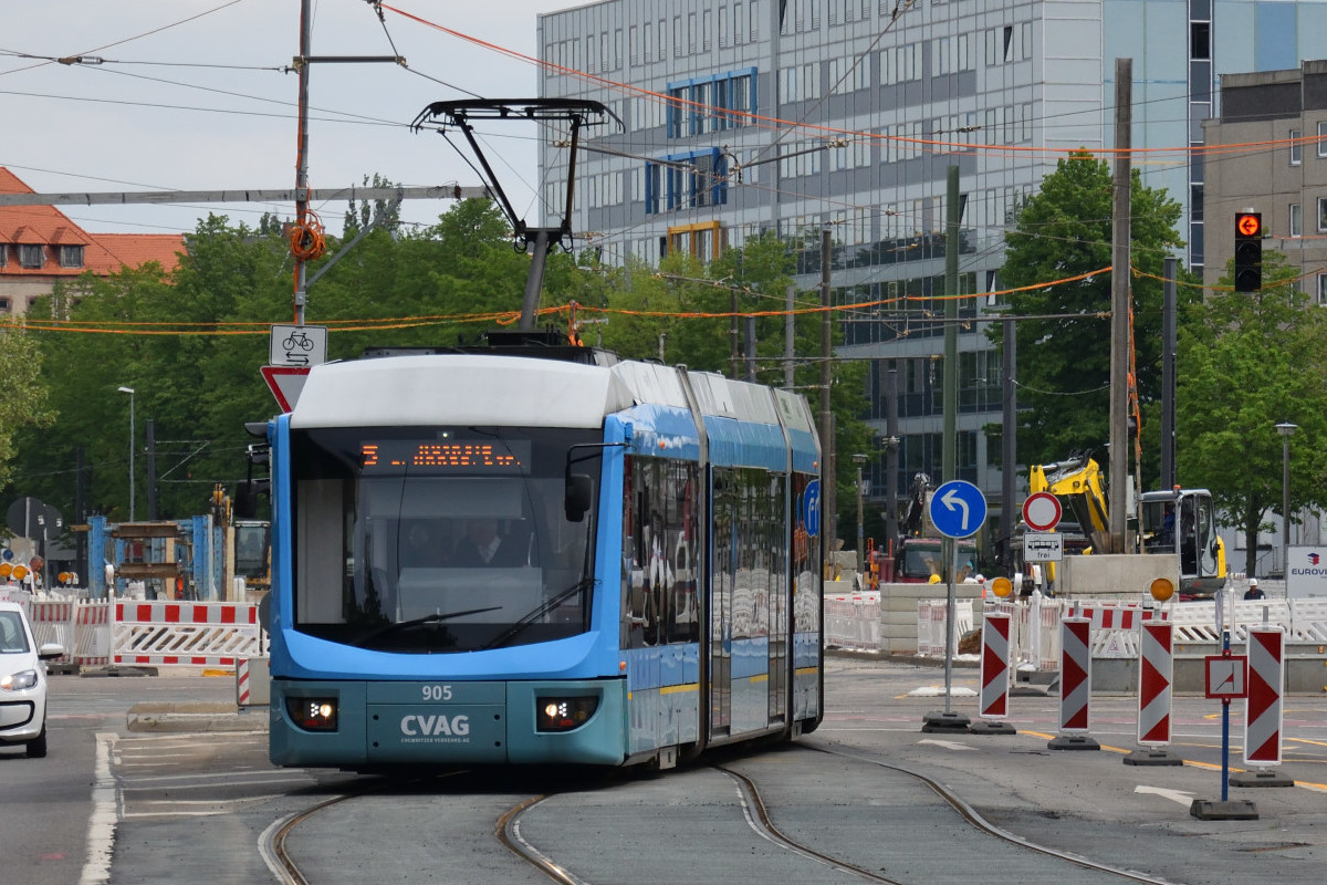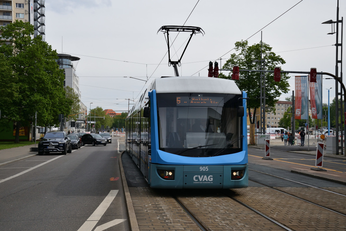 905 in der Baustelle kurz vor der Haltestelle Brückenstraße/Freie Presse