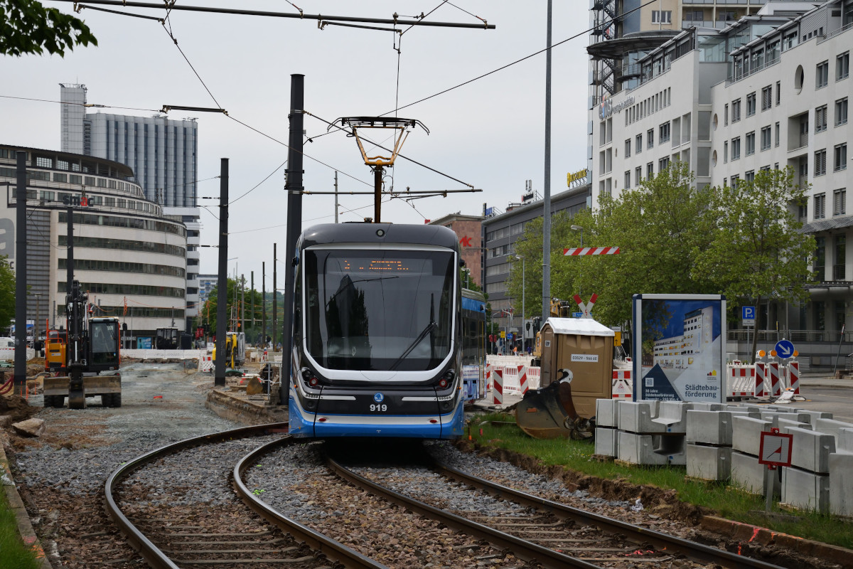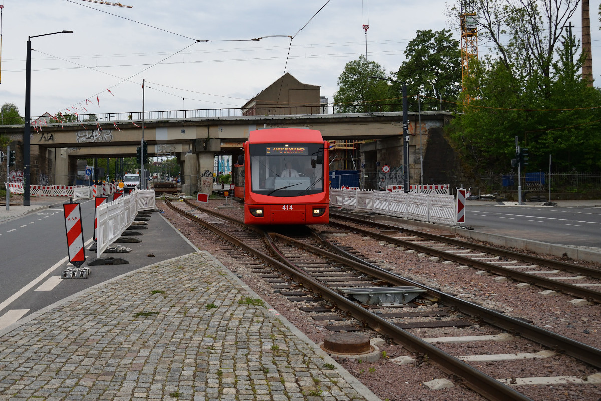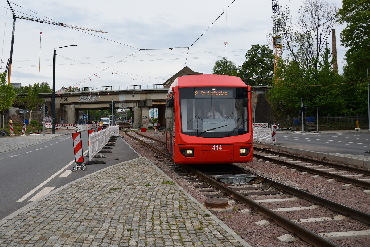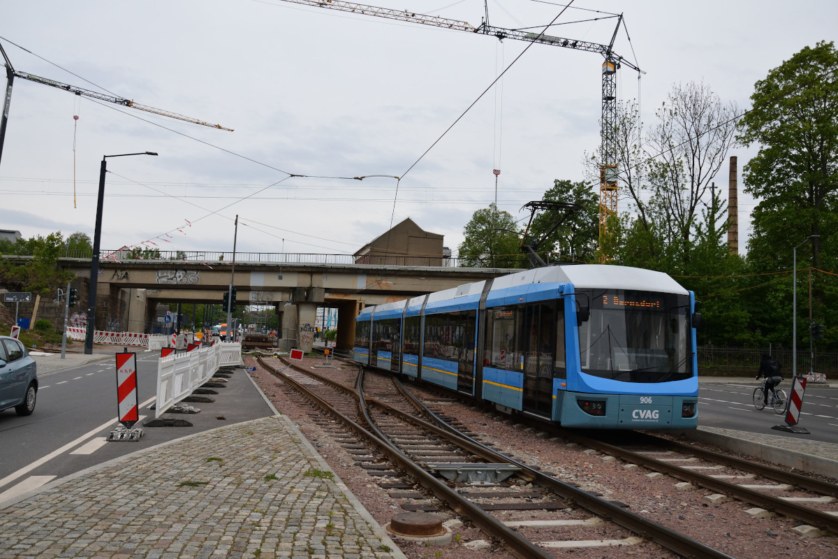906 fährt in die Baustelle hinter der Haltestelle Bernsbachplatz