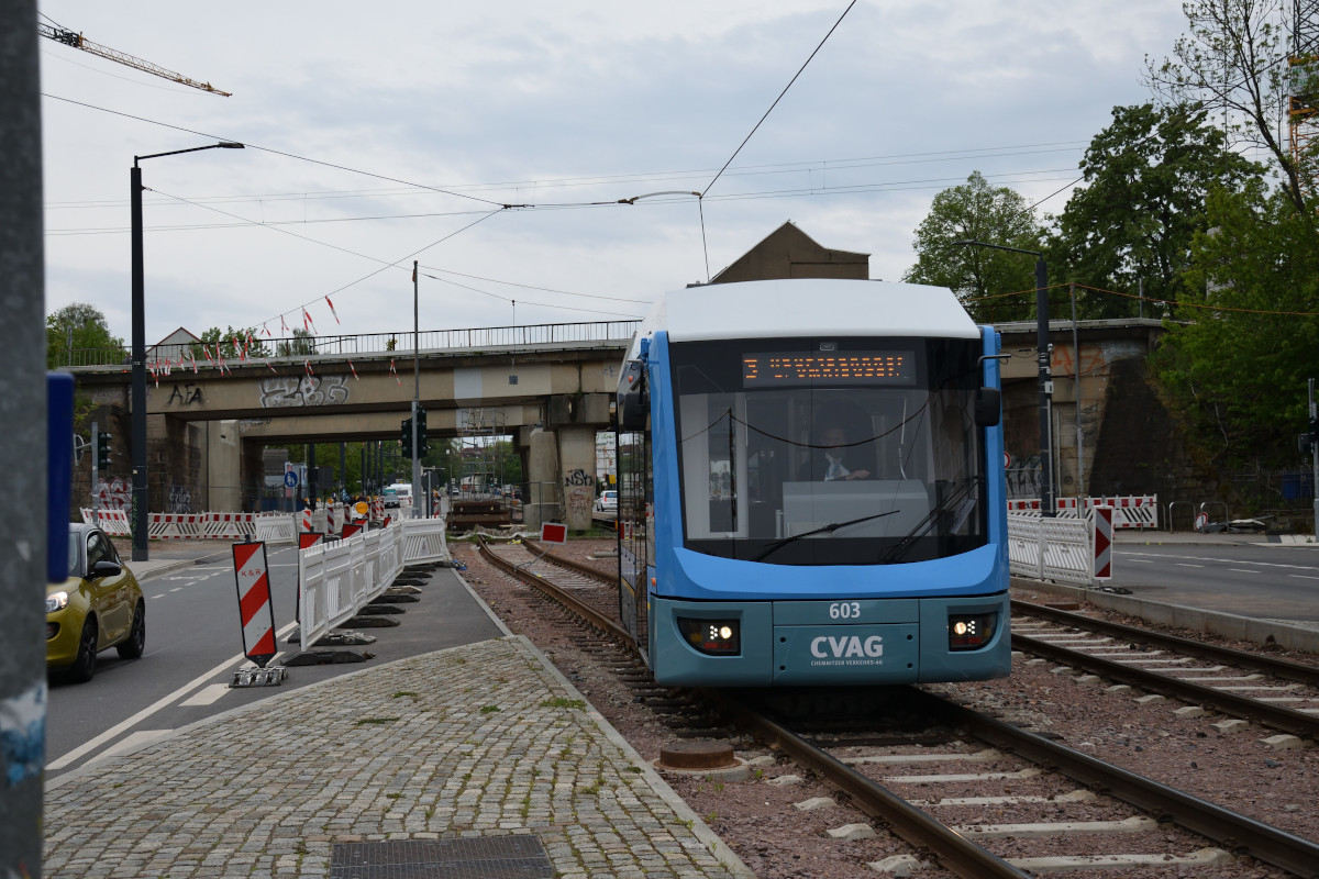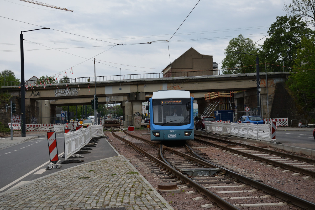 603 in der Baustelle kurz vor der Haltestelle Bernsbachplatz