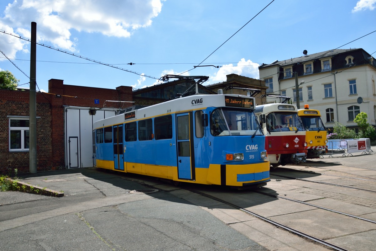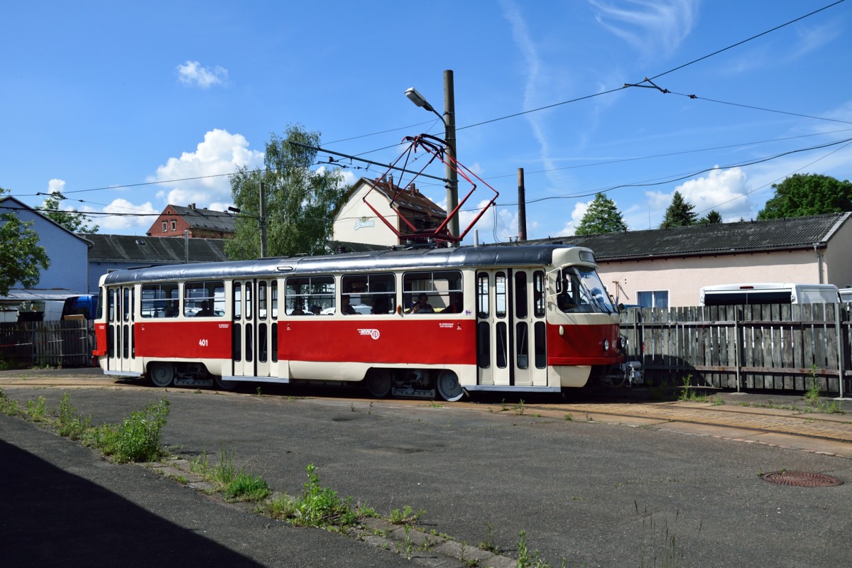 Der Tatra T3D Triebwagen 401 verlässt das Museum in Richtung Hauptbahnhof