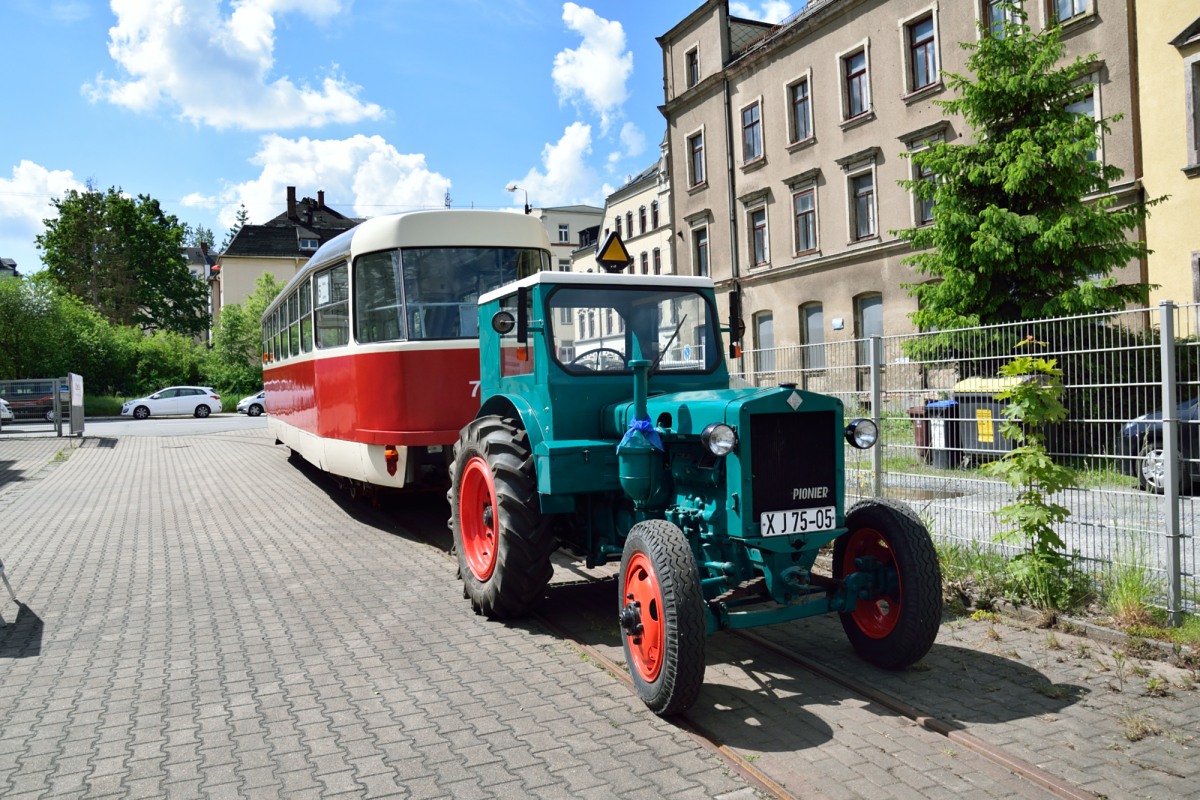 Traktor mit dem auf Schamlspurgestelle aufgebockten Tatra B3D Beiwagen 713